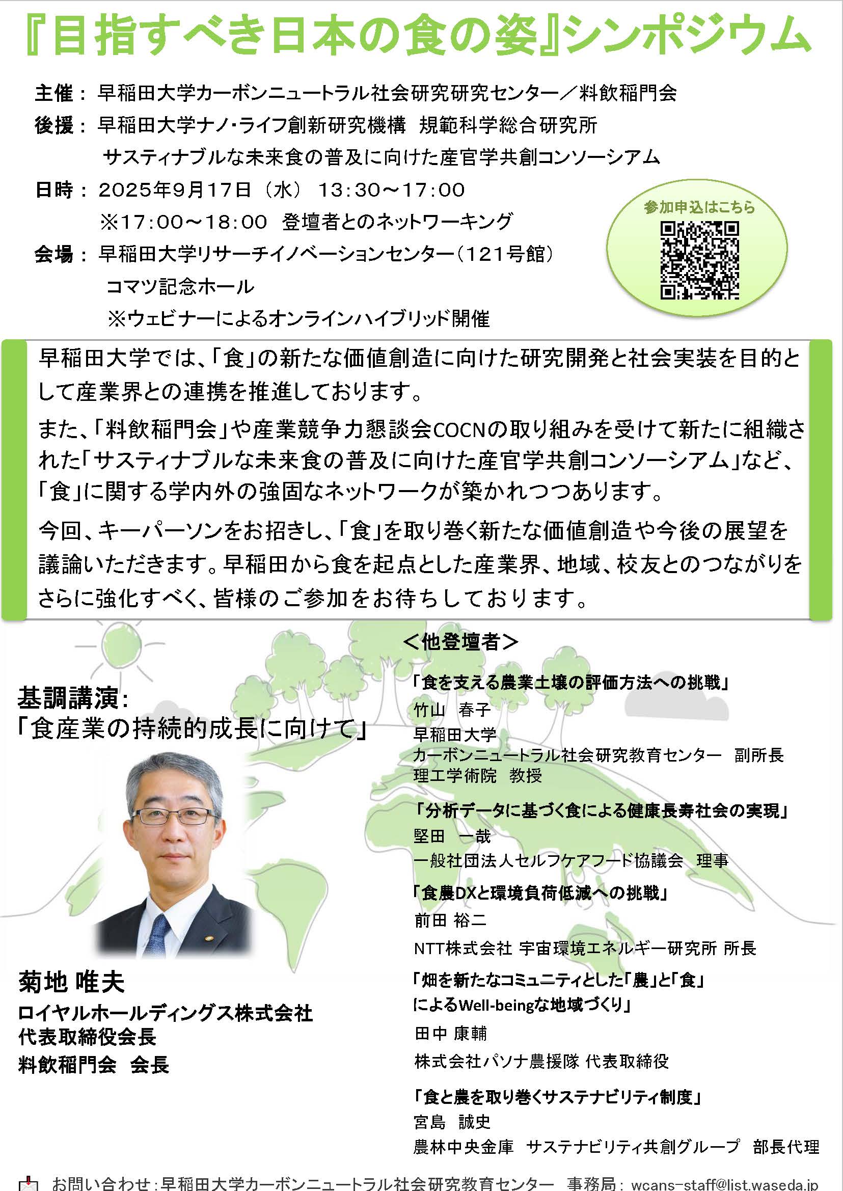 9月17日開催の早稲田大学カーボンニュートラル社会研究センター/料飲稲門会主催 『目指すべき日本の食の姿』シンポジウムで、竹山PMが「食を支える農業土壌の評価方法への挑戦」と題する講演を行います。